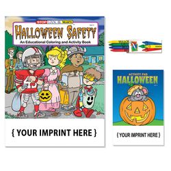 New! Halloween Safety Kit. Combination Gift Kit includes a Halloween Safety Coloring Book, Halloween Activity Pad and 4-pack box of crayons. Packaged together in clear, heat-sealed poly bag.